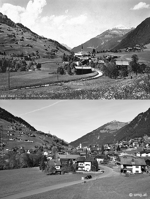 Gaschurn, 1920er Jahre und 2011, Blick talauswärts. Neben dem Talboden beidseits der Ill sind auch die Hangbereiche dichter besiedelt.